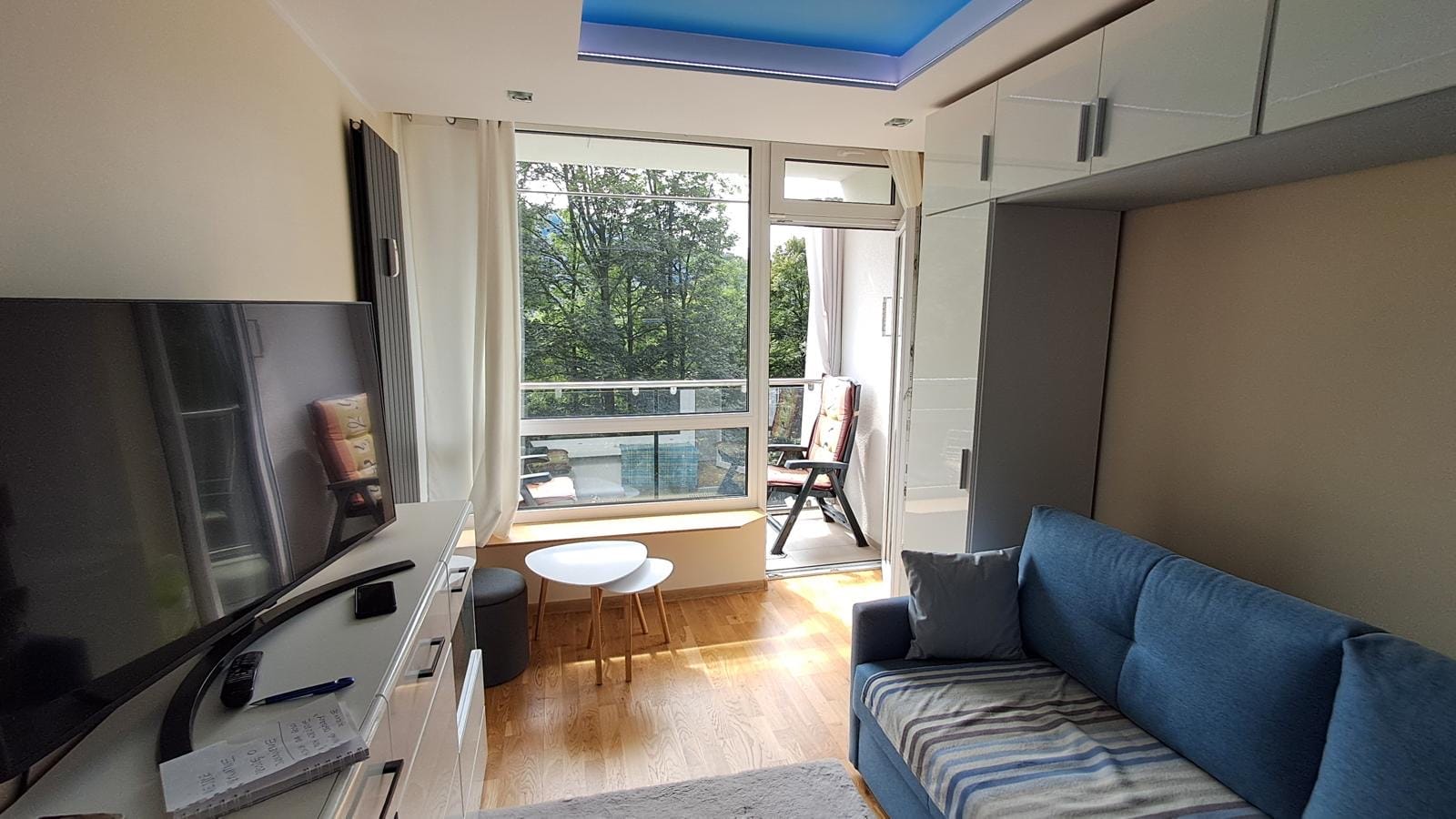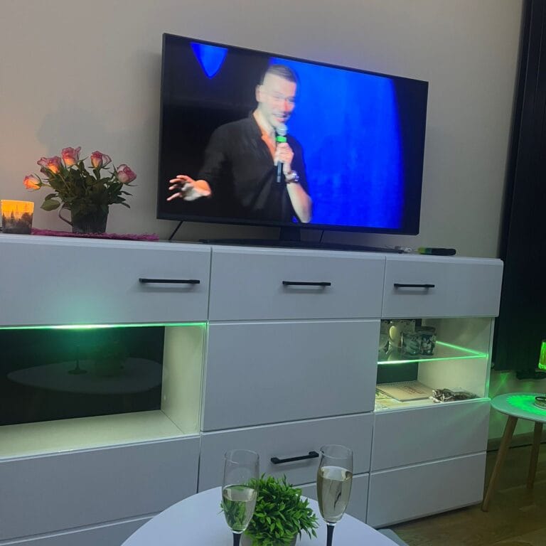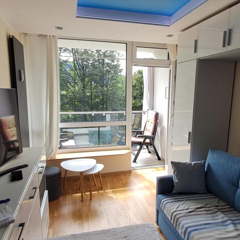 Ten apartament to prawdziwa oda do światła i lekkości. Utrzymany w tonacji czystej bieli, z pięknie wykończonym sufitem w kolorze nieba, tworzy atmosferę spokoju, świeżości i delikatnej elegancji. Wnętrze, które nie tylko zachwyca estetyką, ale też wprowadza w stan głębokiego relaksu – jakby czas płynął tu wolniej, a przestrzeń oddychała wraz z Tobą. Jasne ściany i błękitny sufit współgrają ze sobą niczym poranne niebo nad górskim krajobrazem – subtelnie rozświetlone, pełne harmonii i równowagi. Naturalne światło odbija się od białych powierzchni, tworząc efekt otwartości i lekkości, a błękit nad głową wprowadza ukojenie i poczucie przestrzeni.