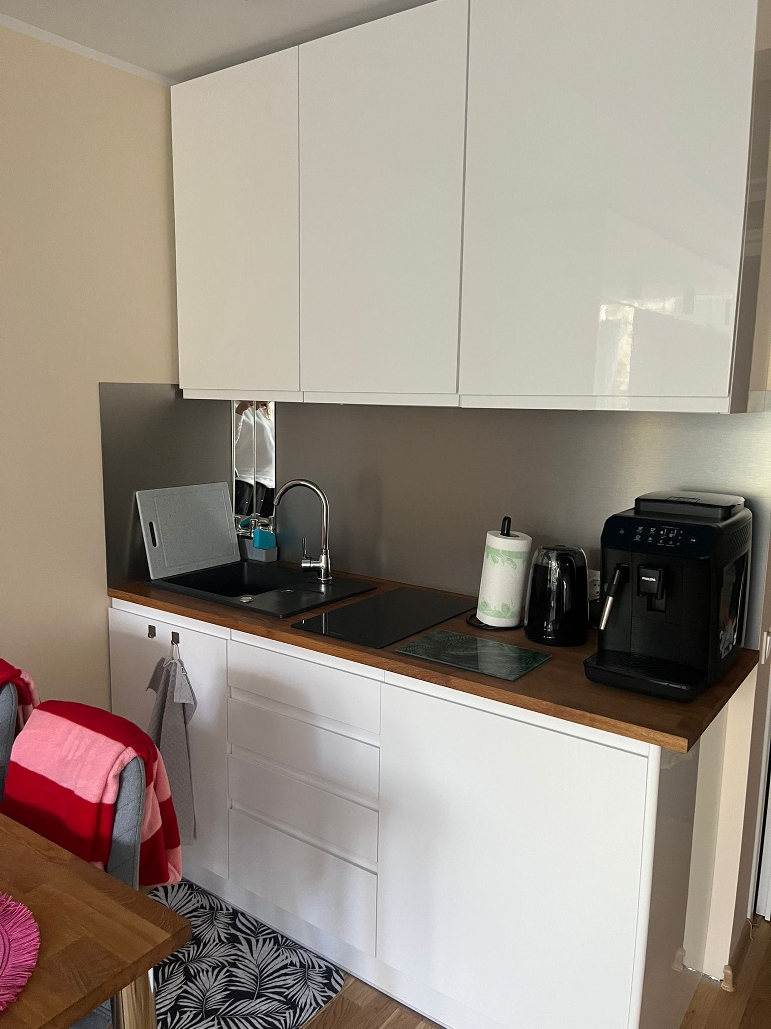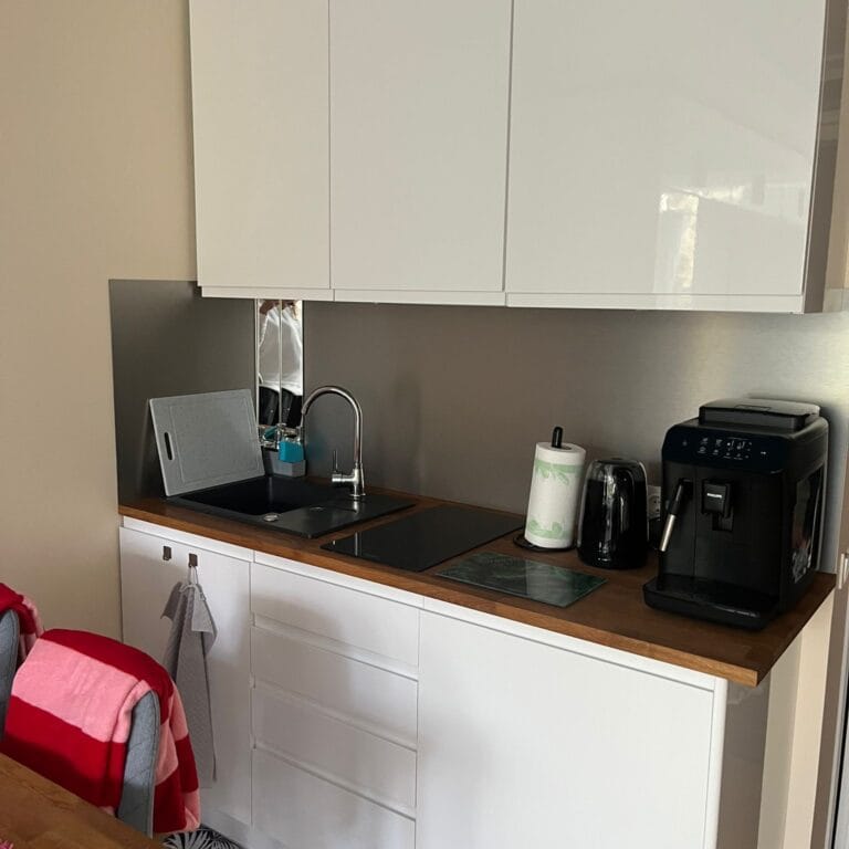 W pełni wyposażony! Lodówka, płyta kuchenna, ekspres do kawy, czajnik, stół i wszystkie niezbędne przybory w tym kawa, herbata, cukier, przyprawy.