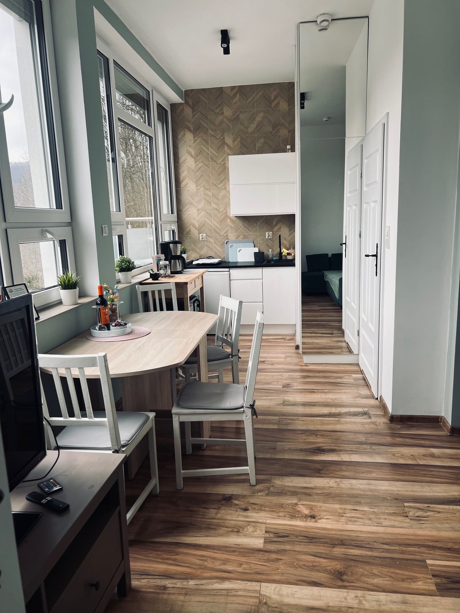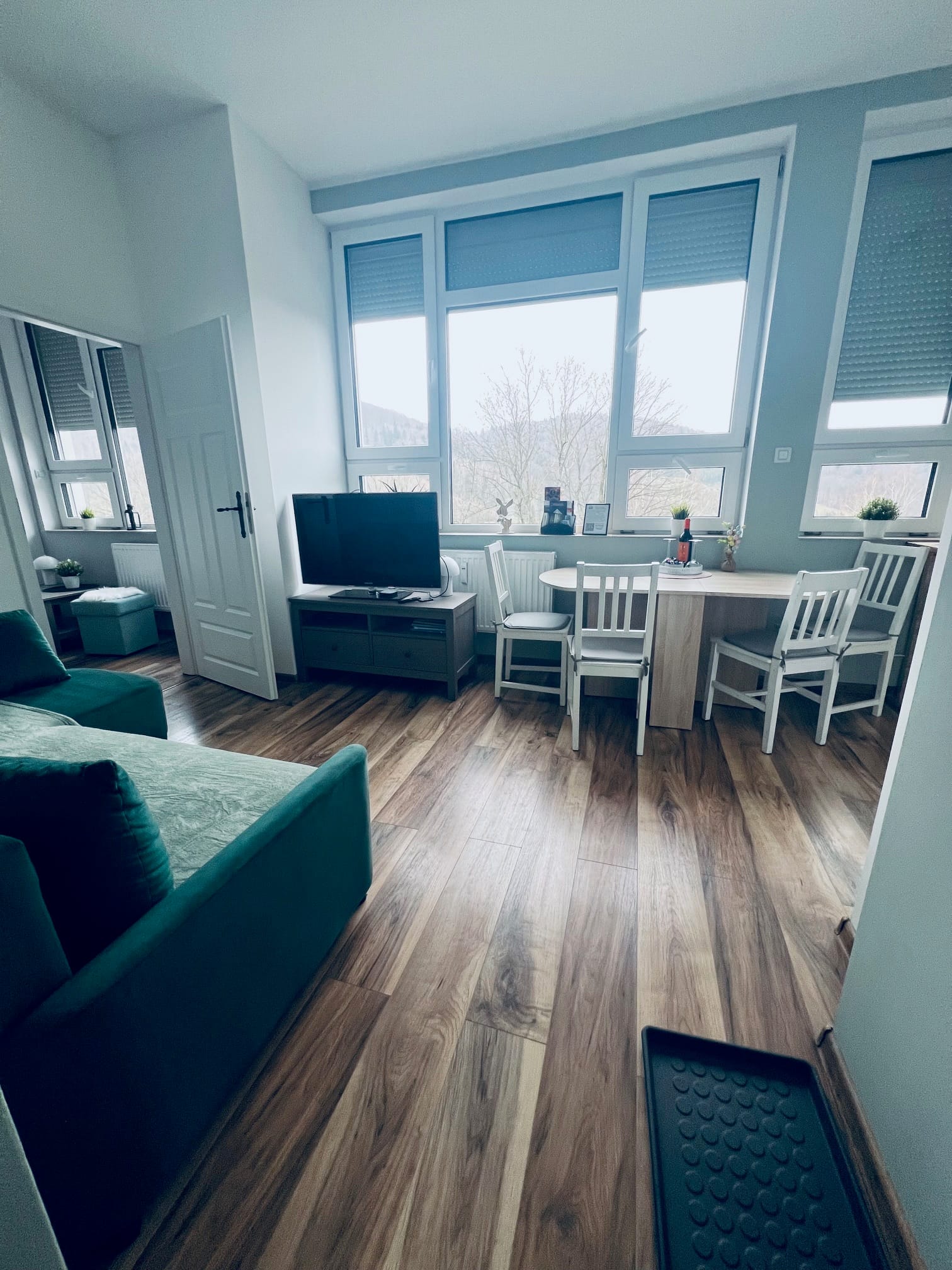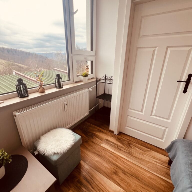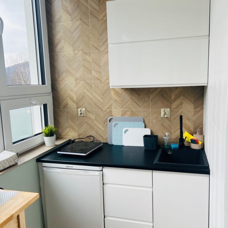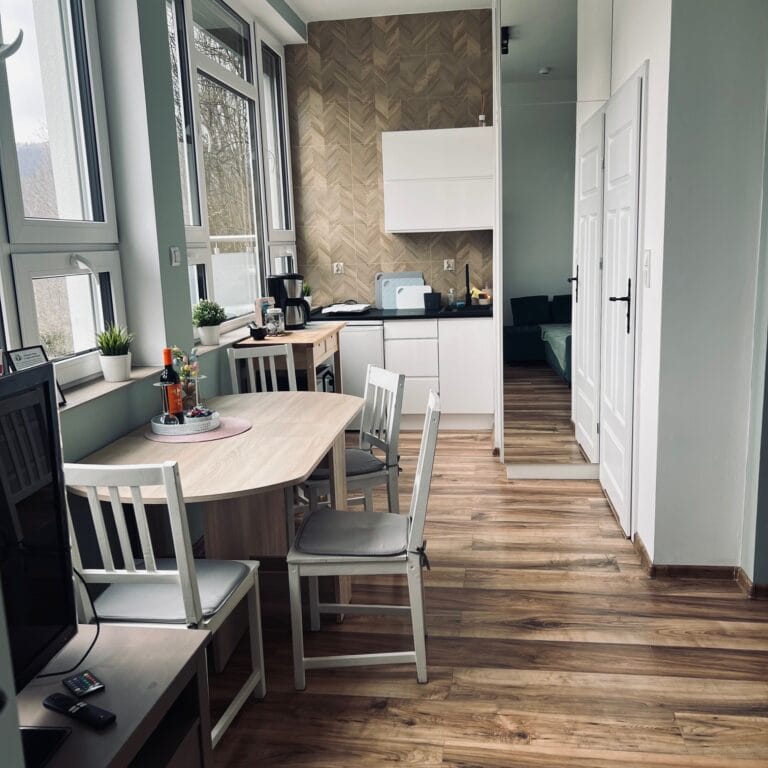 Ten apartament to kwintesencja świeżości, lekkości i elegancji. Dominująca biel w połączeniu z delikatnymi odcieniami szarości i mięty tworzy przestrzeń pełną spokoju i subtelnego uroku. Już od progu czuć tu atmosferę relaksu, którą dopełnia cudowny widok na góry, rozpościerający się z okien i balkonu apartamentu. Jasne ściany optycznie powiększają wnętrze, nadając mu czystości i przejrzystości, a mięta w szaro-zielonym tonie wprowadza nutę świeżości i naturalnego chłodu. To połączenie sprawia, że przestrzeń jest nowoczesna, ale ciepła, elegancka, a zarazem przytulna.