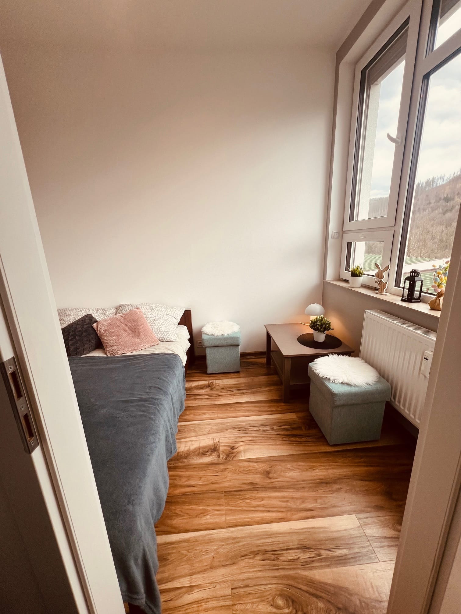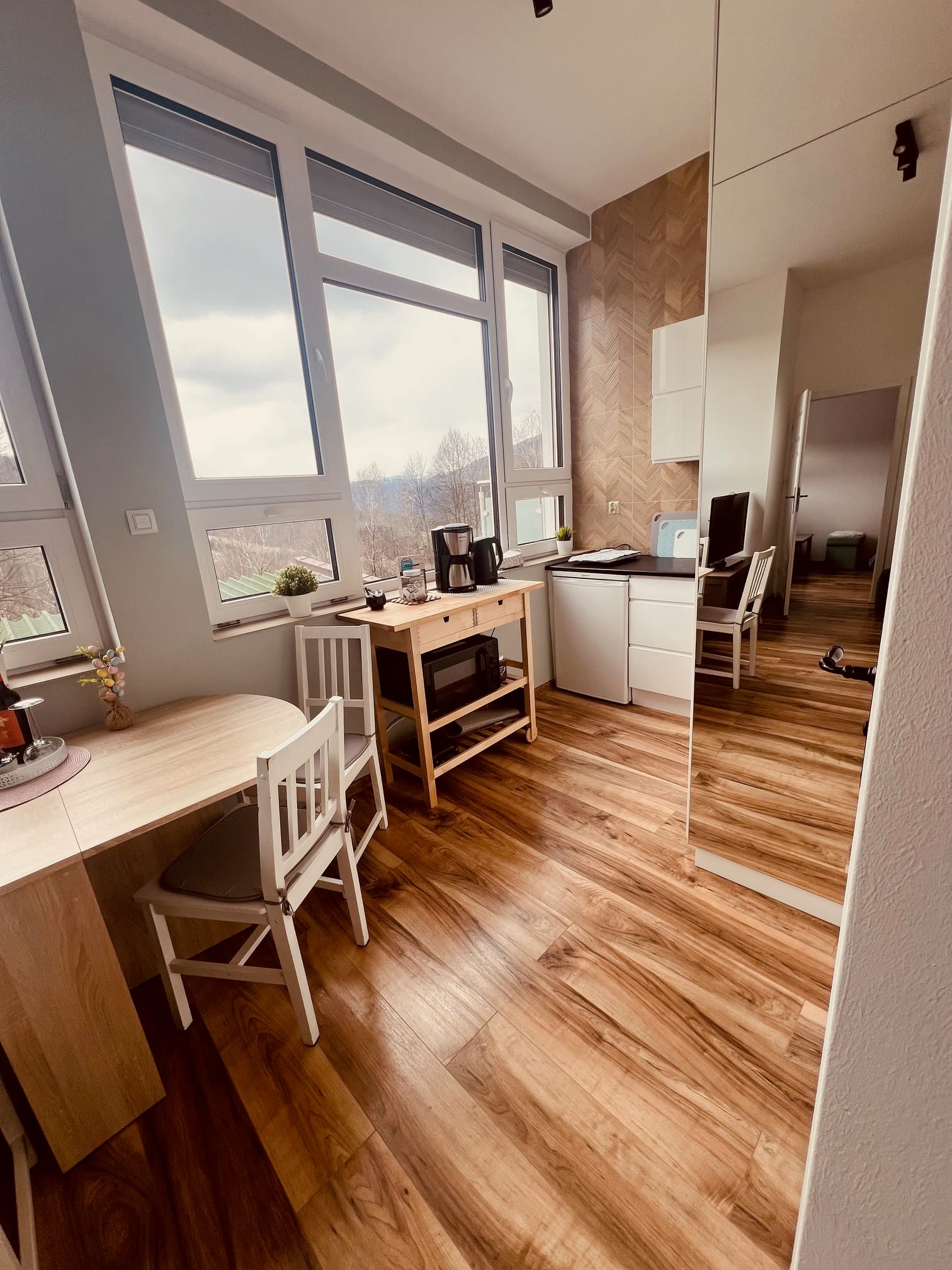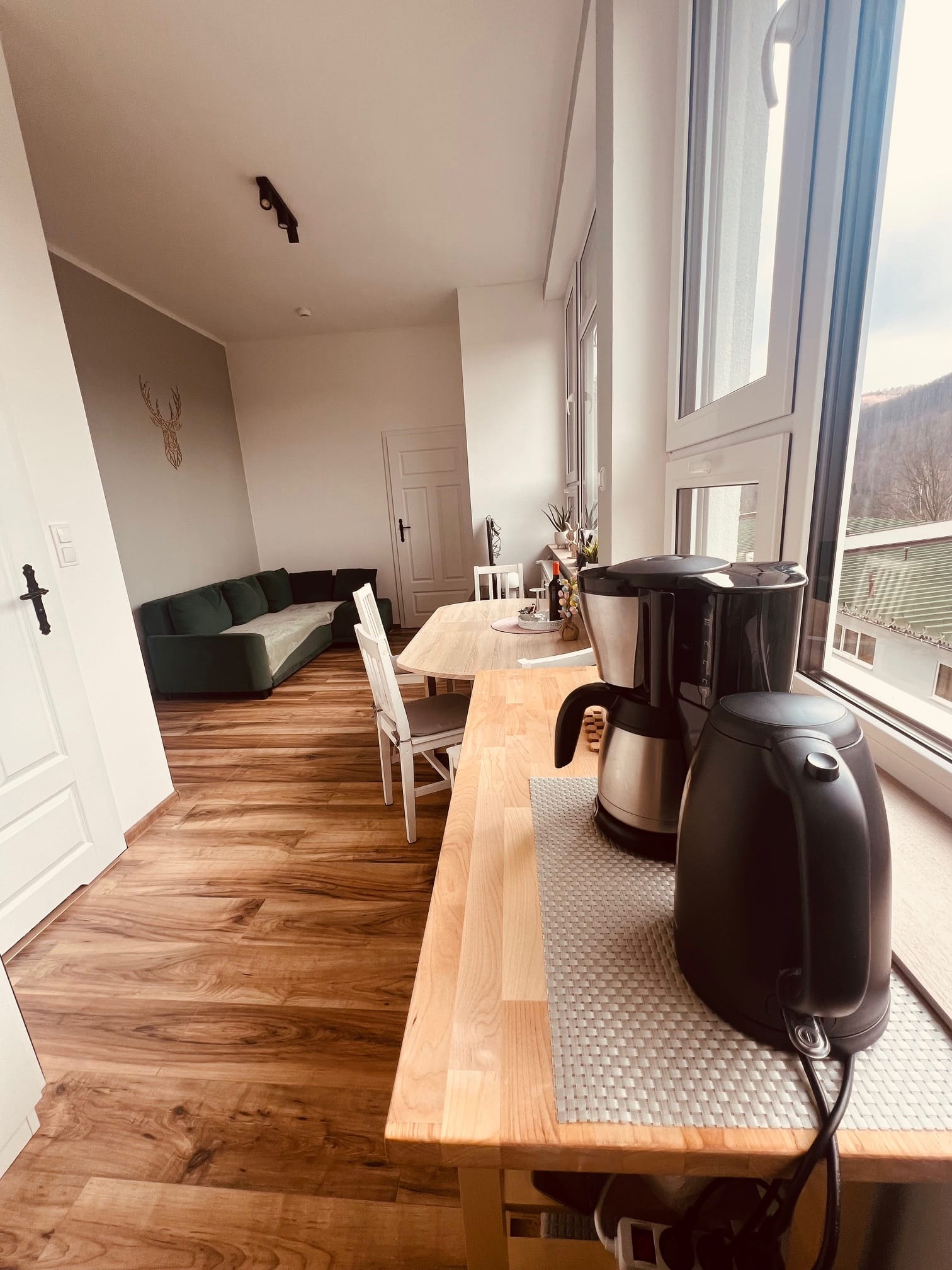 Ten apartament to kwintesencja świeżości, lekkości i elegancji. Dominująca biel w połączeniu z delikatnymi odcieniami szarości i mięty tworzy przestrzeń pełną spokoju i subtelnego uroku. Już od progu czuć tu atmosferę relaksu, którą dopełnia cudowny widok na góry, rozpościerający się z okien i balkonu apartamentu. Jasne ściany optycznie powiększają wnętrze, nadając mu czystości i przejrzystości, a mięta w szaro-zielonym tonie wprowadza nutę świeżości i naturalnego chłodu. To połączenie sprawia, że przestrzeń jest nowoczesna, ale ciepła, elegancka, a zarazem przytulna.