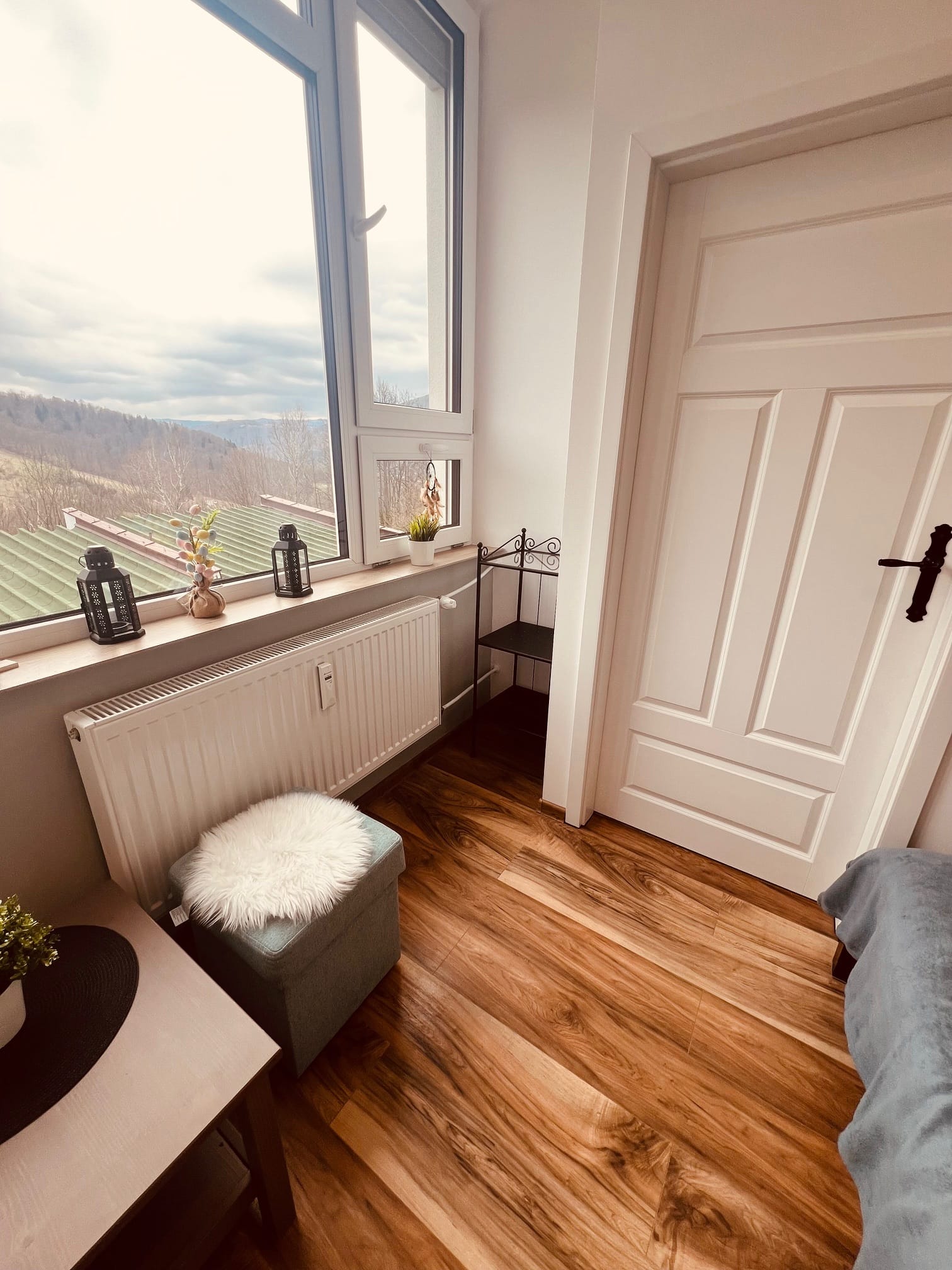 Apartament w stylu jasnej harmonii – biel i szaro-miętowe akcenty z widokiem na góry