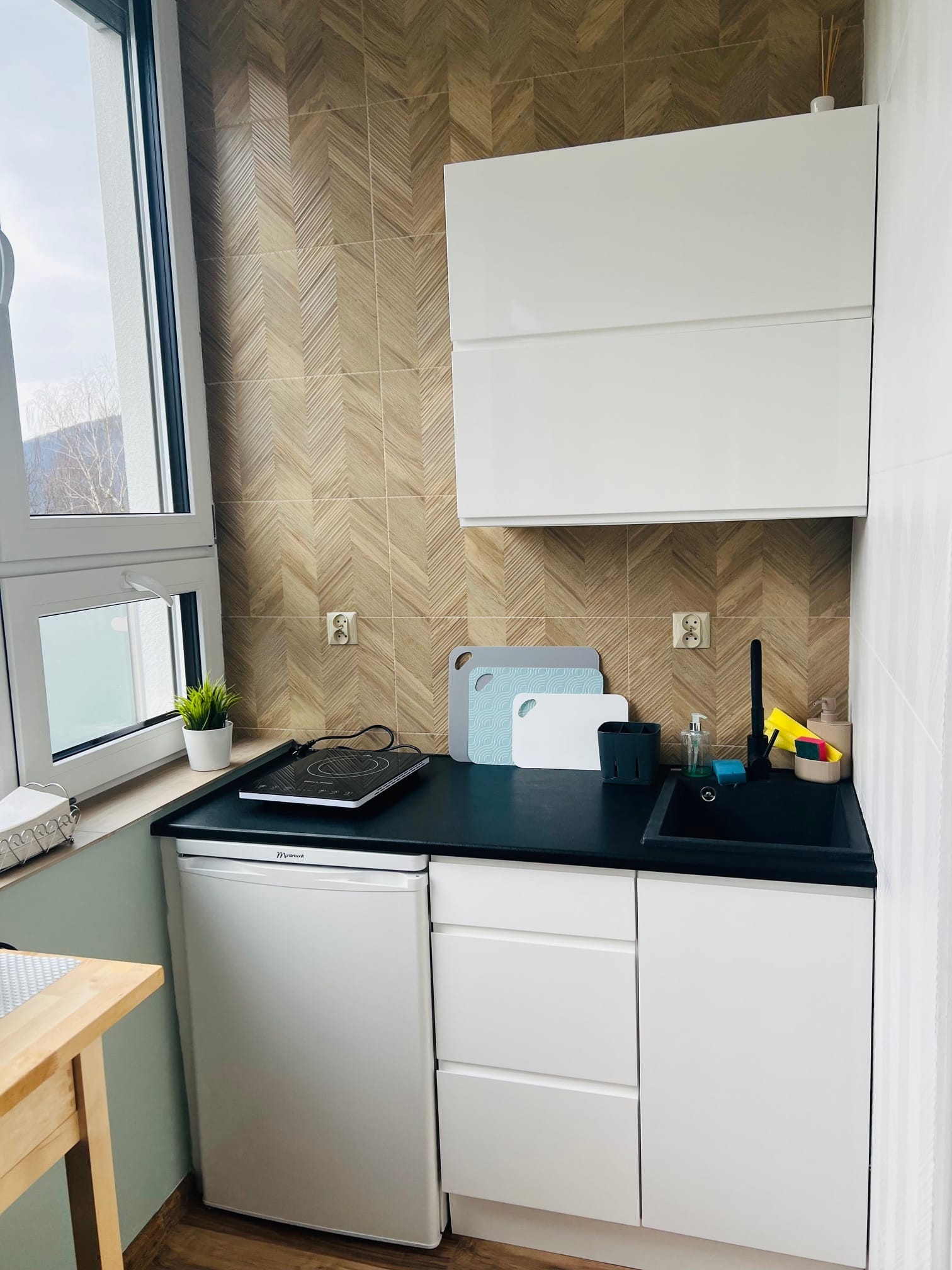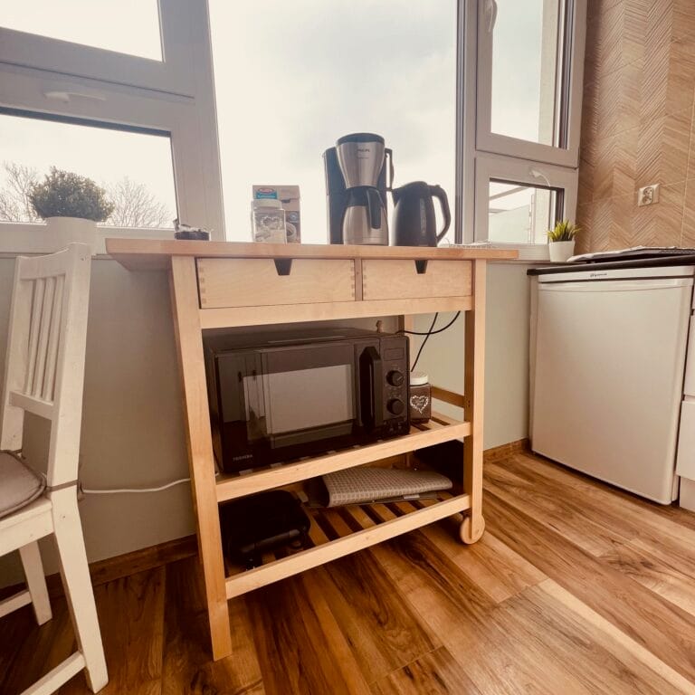 W pełni wyposażony! Lodówka, płyta kuchenna, ekspres do kawy, mikrofalówka, czajnik, stół i wszystkie niezbędne przybory w tym kawa, herbata, cukier, przyprawy.